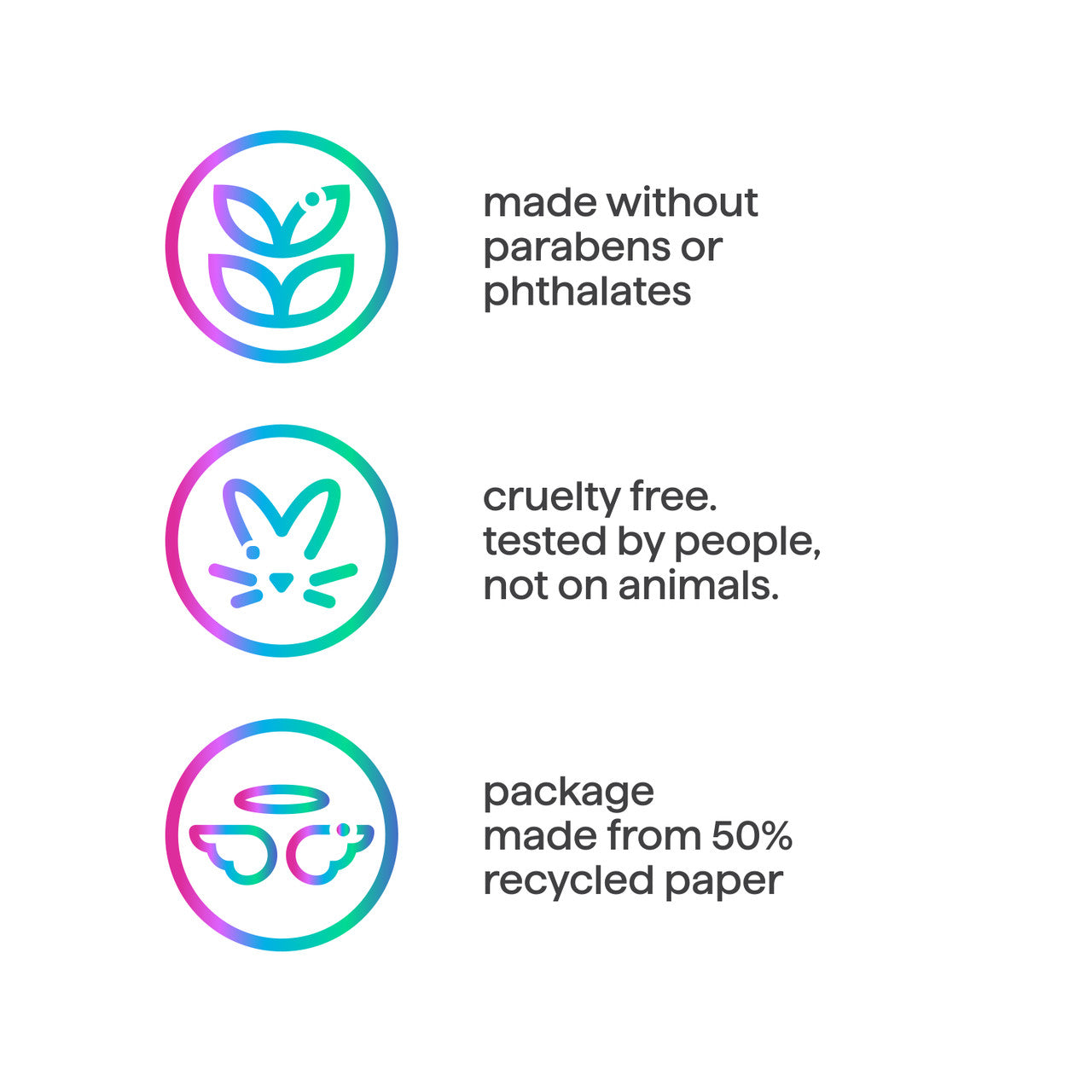 • cruelty free. tested by people. not on animals.